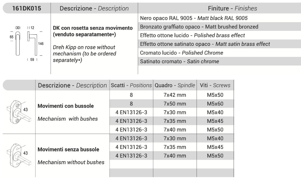 Please specify the type of movement (with or without bushings) and frame when ordering: