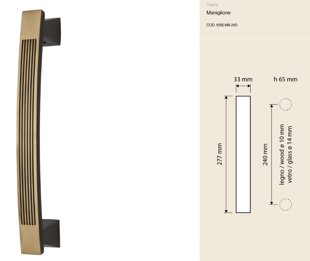 Crafted entirely of brass in the Brescia artisan district, the Opera pull handle demonstrates the attention to detail and construction quality that have always distinguished true Made in Italy products. The precise, well-defined grooved surface highlights the solidity of the metal and creates a play of light and shadow that enhances its depth and elegance.