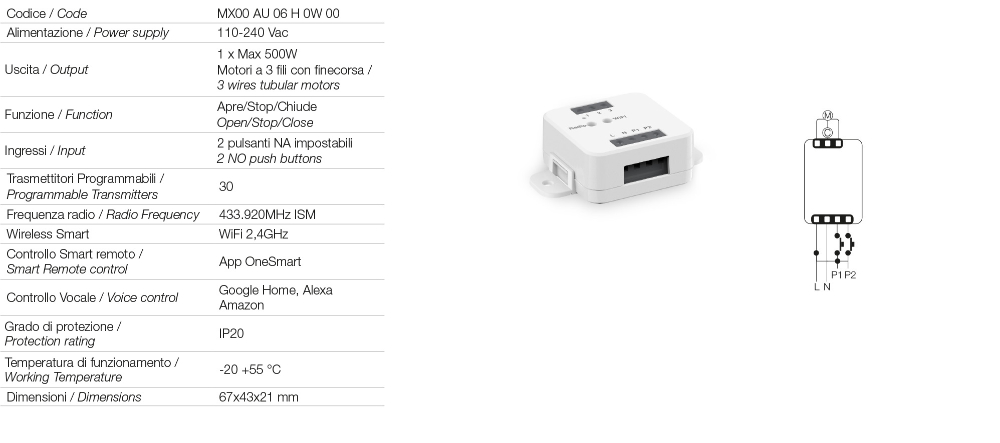- Wi-Fi control unit for 230Vac actuators and motors with limit switches;