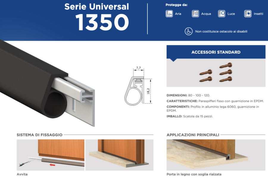 Draft stopper 1350 Comaglio Universal Series is an ideal solution for doors with raised thresholds, designed to effectively protect against air, water, light and insects. Thanks to its