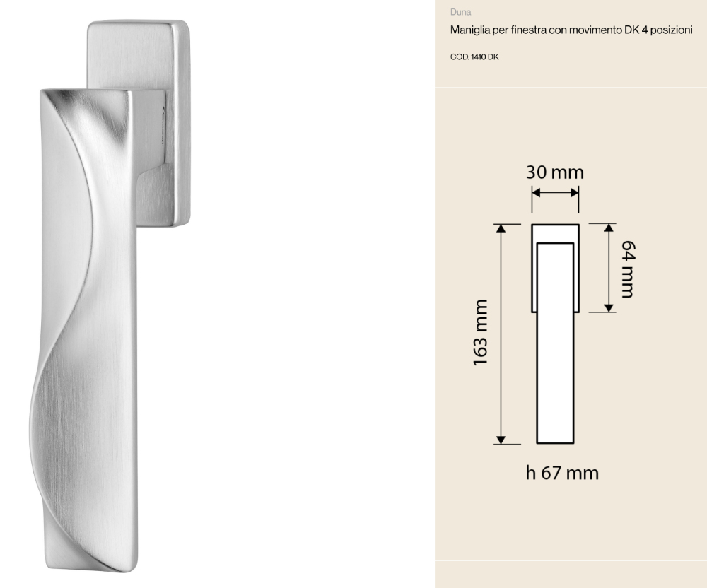 Duna Linea Calì - 4-position DK window handle by Linea Calì that interprets the movement of dunes with a light wave engraved on the surface.