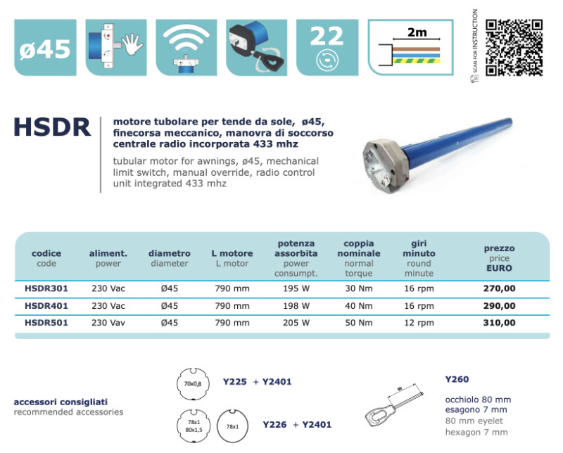 HSDR401 - tubular motor for awnings, ø45, mechanical limit switch, emergency operation, built-in radio 433 mhz
