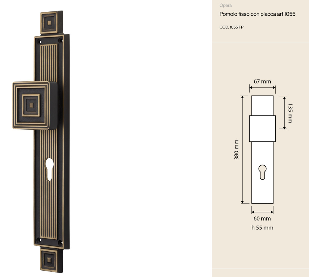 Opera Linea Calì fixed doorknob with plate is a piece of furniture that immediately captures attention: solid, elegant, and with a bold character. Its perfectly balanced geometric shapes, along with the plate decorated with vertical lines, recall neoclassical style, reinterpreted in a contemporary way to fit even the most modern interiors.