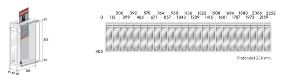 Technical drawing of the version with 12 mailboxes in bronze finish (letterbox R hanging version):