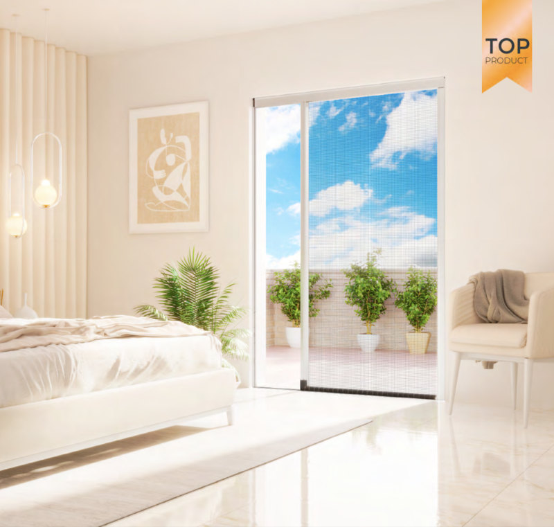 Mega protection, mega resistance and mega comfort. The Mega Effezeta System mosquito net is a lateral sliding mosquito net with retractable track guideand windproof system .