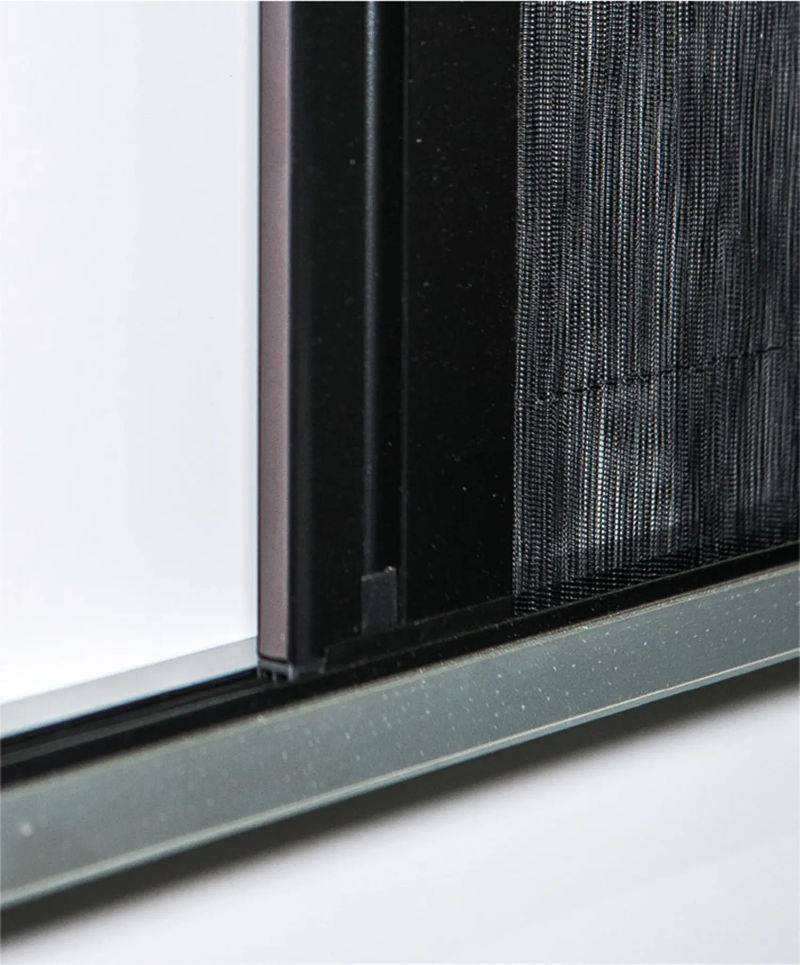 Lateral sliding mosquito net with floor guide of only 4 mm, which always allows an effective hermetic closure. It is suitable for both windows and doors. The net is kept taut by threads that do not prevent it from coming out in case of wind. Overall dimensions of only 18 mm.