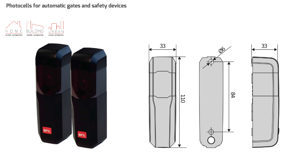 The wide power supply compatibility (12–33 Vac and 15–35 Vdc) allows the kit to be used in almost all automatic gate installations. The photocells can be used with all BFT control units that support verified safety management.