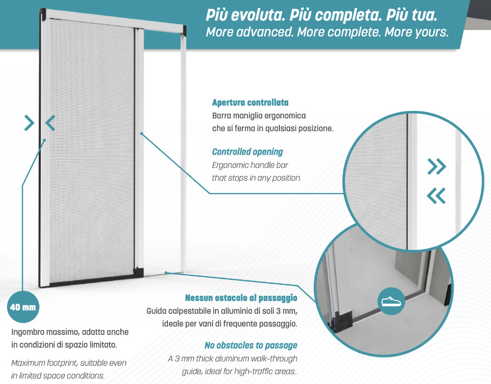 The essential design, combined with the tank track, ensures stable sliding and smooth everyday use. It features a modern, clean structure, ideal for integrating into contemporary environments. The mosquito net slides sideways and is designed to fit the most common domestic French doors.