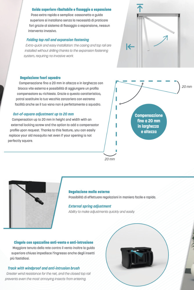 Out of square adjustment Compensation system up to 20 mm in both height and width, with external screw locking and the option to integrate a compensator profile upon request. This solution allows for quick and easy replacement of existing mosquito nets, even in spaces that aren't perfectly square.