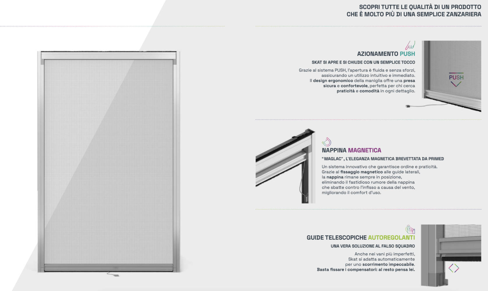 SKAT PRIMED is the compact and technological vertical roll-up mosquito net designed for windows: smooth opening with the PUSH system, silent magnetic tassel and precise installation thanks to the self-regulating compensators.